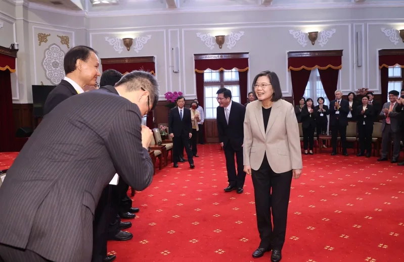 總統蔡英文(前右)2日在總統府接見「2022第18屆國際傑出發明家獎得獎人」,感謝所有得獎人對於研究的投入,帶動台灣的進步發展。