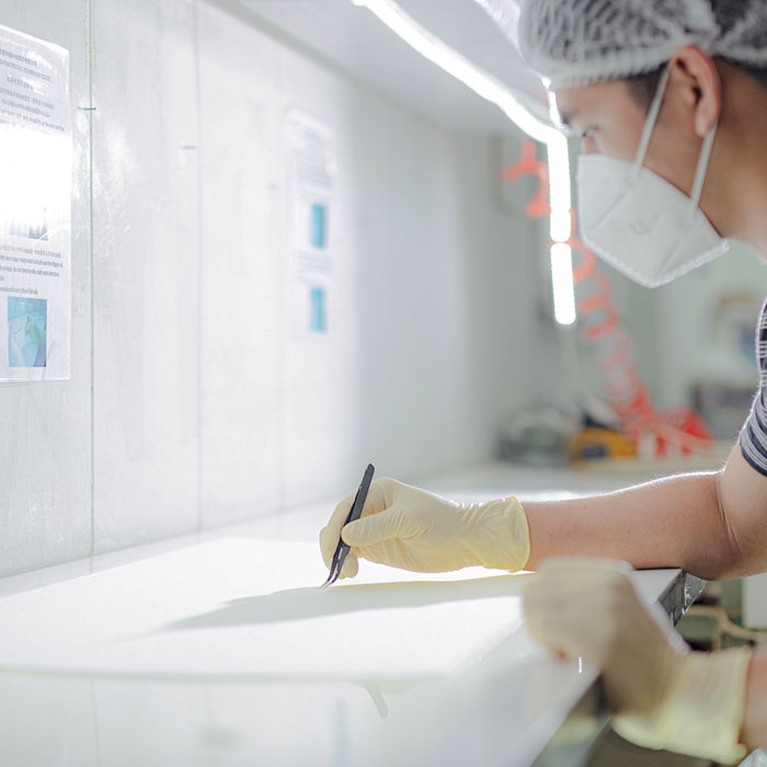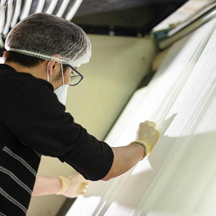 於LED聚光燈下檢驗,清除附著於布面上的異物,提高產品的潔淨度。 |