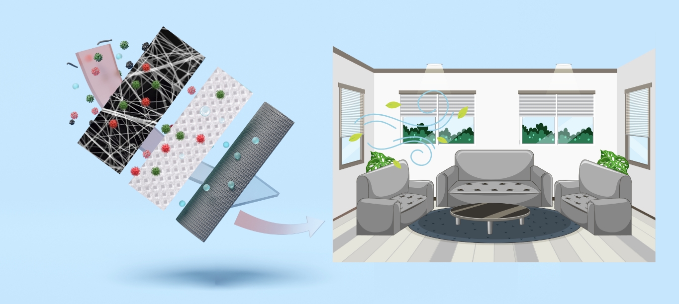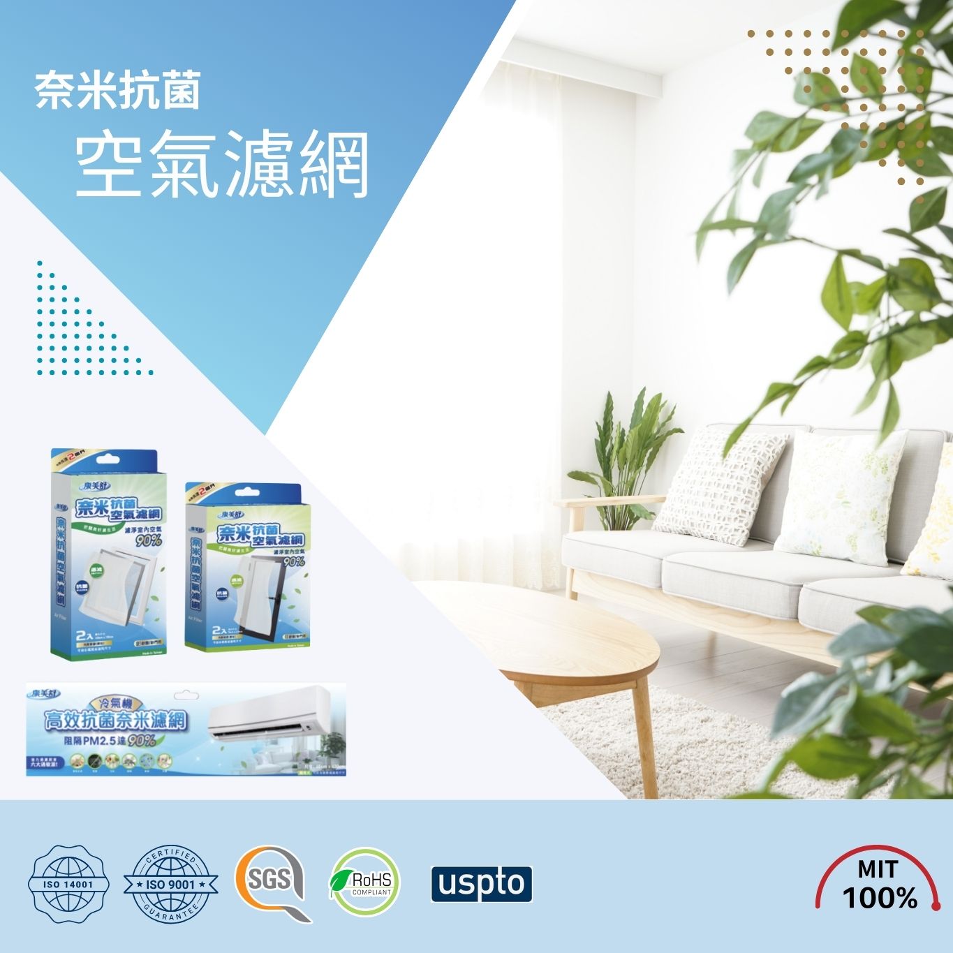 自主研發奈米纖維專利技術,能有效阻隔空氣細菌及病毒,並具有99%以上減菌功能。亦有效抑制、過濾空氣中細懸浮微粒、PM2.5。